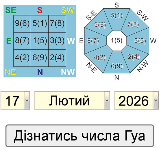 Тут ви можете розрахувати своє індивідуальне число Гуа за датою народження. І отримати квадрат лошу з розташуванням чисел гуа по секторах. А також дізнаєтесь про свої рекомендації на поточний рік. Просто введіть...